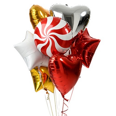 Фонтан состоит из 7 фольгированных шаров , цвет меняется по желанию заказчика , шар с рисунком может быть другим